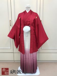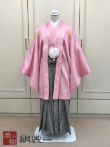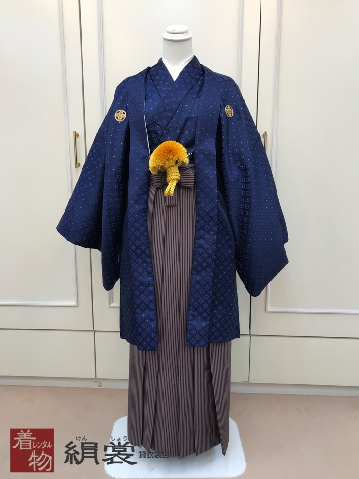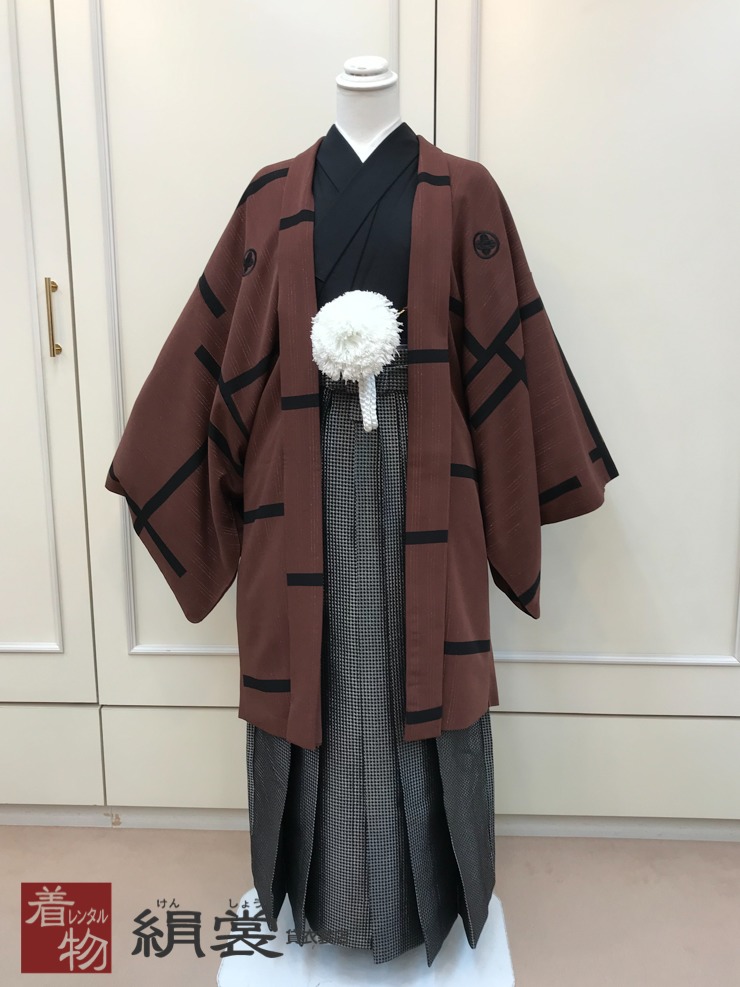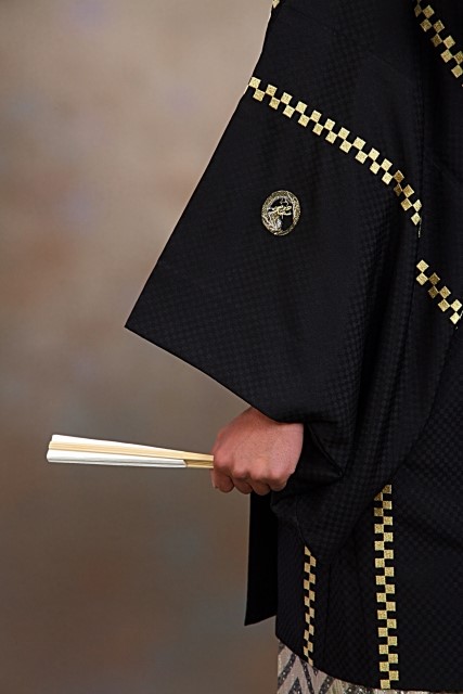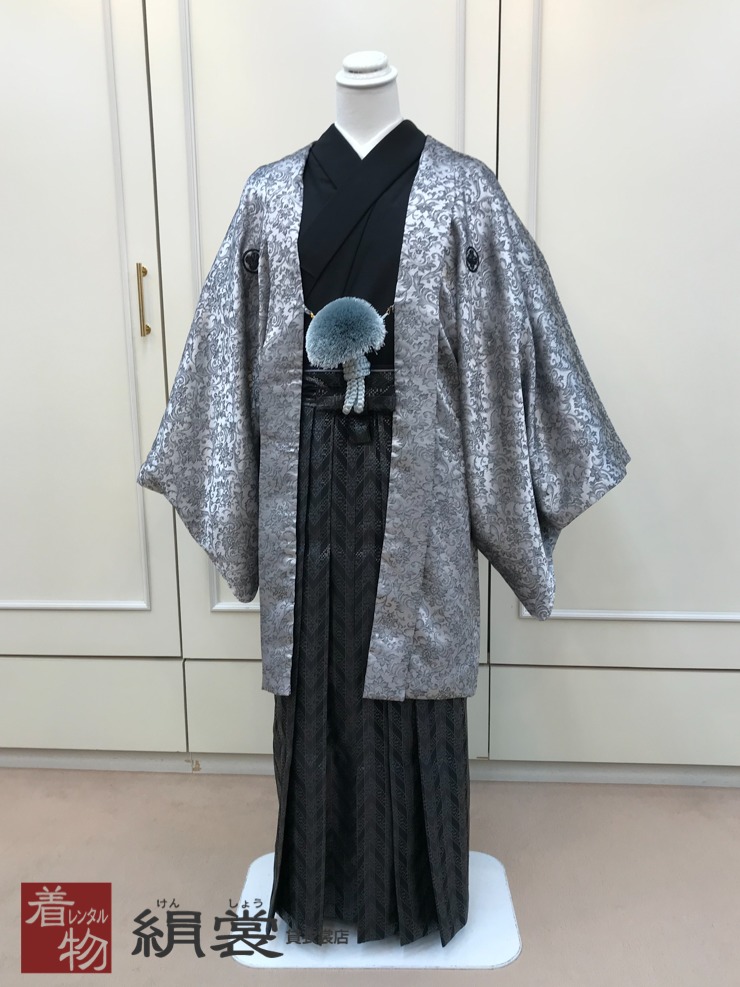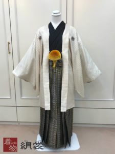 黒無地の羽織と長着に五つ紋をつけて仙台平と呼ばれる縞織りの袴を合わせるのが第一礼装で、式典、襲名式、結婚式など格式ある行事で着用します。20歳の記念にお一人はもちろんご友人とご一緒に着用されると周囲との差が付きます。